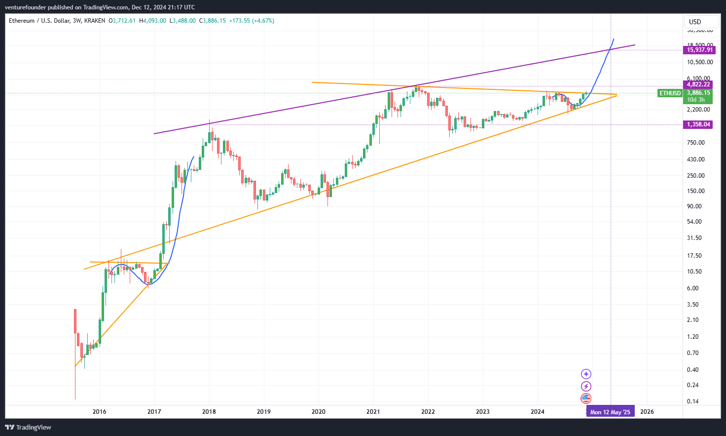 Ethereum is poised to close another weekly green candle, provided its price stays above $3,712, according to prominent crypto analyst VentureFounder. The analyst’s long-term outlook places ETH price to reach a target of $15,937 by May 2025. In the short term, VentureFounder suggests Ethereum’s next three-week green candle could push the cryptocurrency to its previous all-time high of $4,900.
