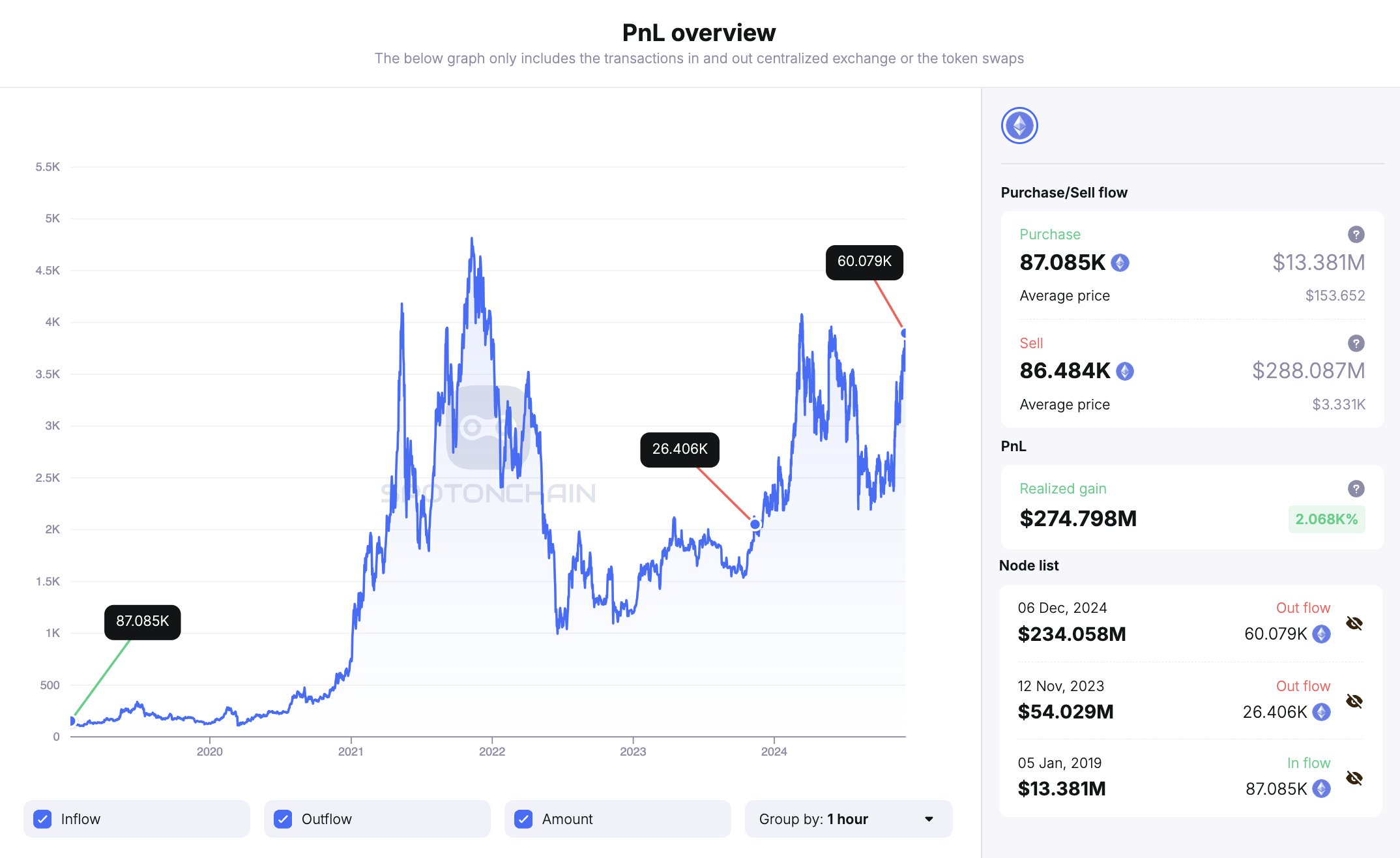 In a strategic move, the whale began redepositing ETH to Bitfinex in November 2023 and December 2024, totaling 86,484 ETH at an average price of $3,331.