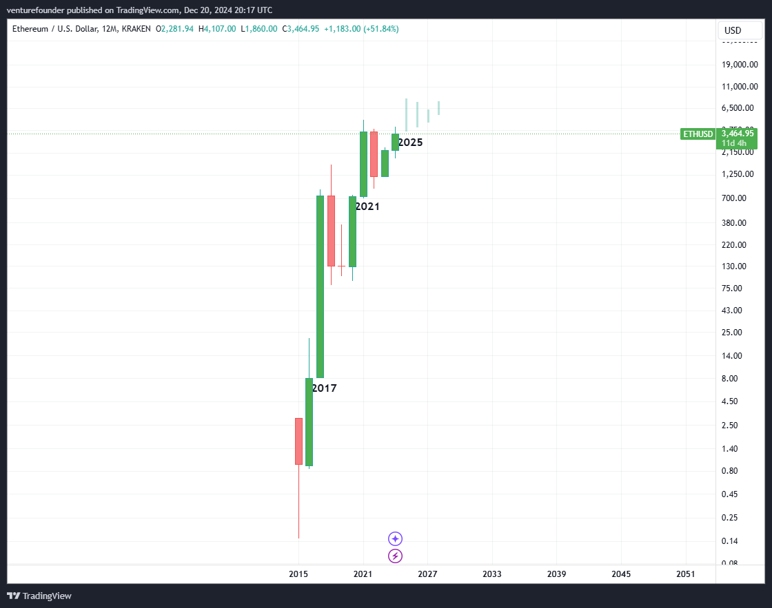 Another crypto analyst venturefounder noted that Ethereum is still on track to new all-time highs in 2025, supported by whale buying. The analyst compared the current four-year cycle (2021–2024) to the previous one (2016–2020), highlighting striking similarities. According to the analysis, Ethereum’s performance in the year following a Bitcoin halving—such as 2017 and 2021—has historically marked significant growth phases. Previously, venturefounder gave an ETH price target of over $15,000 by May 2025.
