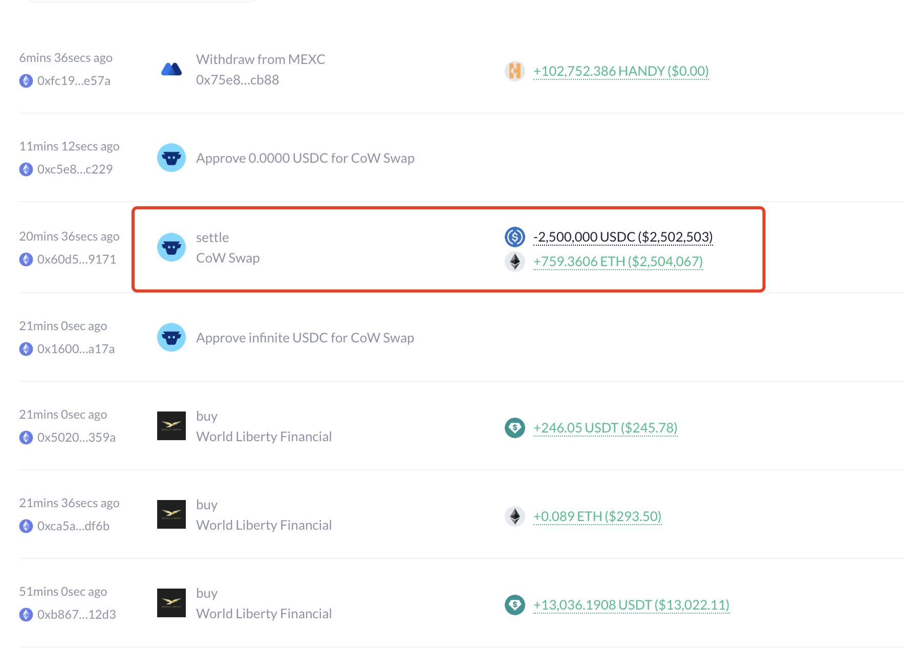 The activity by Ethereum whales underscores renewed interest from large investors, who appear to be capitalizing on the market’s recovery momentum. On the other hand, Donald Trump’s DeFi Project World Liberty Financial has continued its ETH buying spree, spending a total of 2.5 million USDC stablecoin to acquire an additional 759 ETH.