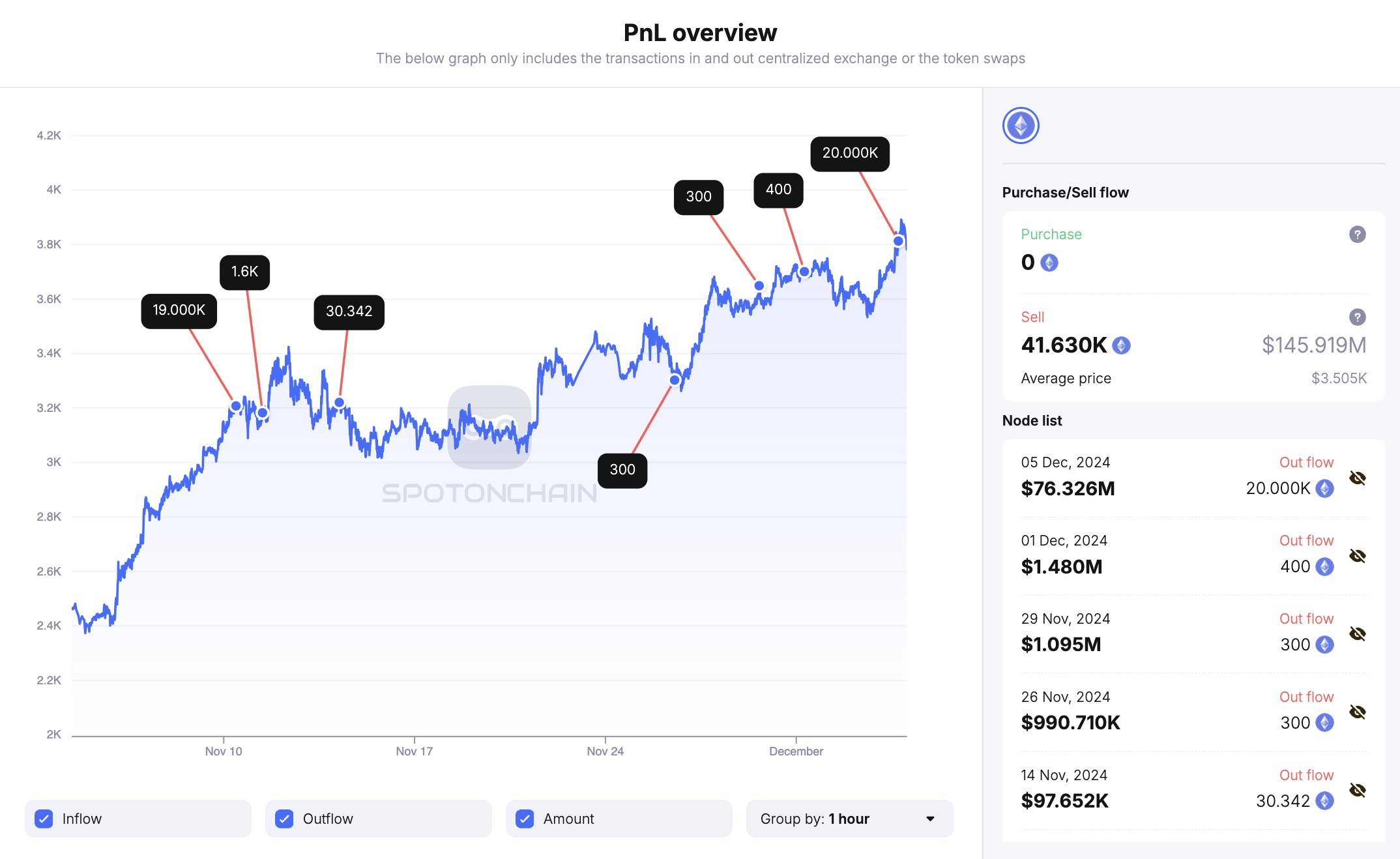 Sun has been actively moving Ethereum into centralized exchanges since the cryptocurrency began its rebound in early November. In total, he has deposited 41,630 ETH, worth $145.9 million, including 39,000 ETH, worth $137 million, to HTX and 2,630 ETH, worth $8.76 million to Poloniex. The average purchase price for these deposits is estimated at $3,505 per ETH.