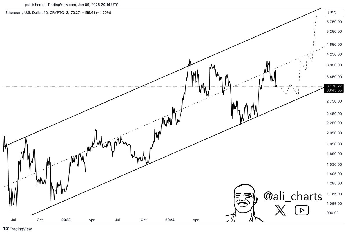 Ethereum price trajectory suggests a potential rebound at $2,800, possibly acting as a launchpad for a $6,000 target. Analysts highlight an ascending parallel channel, indicating a critical support zone near $2,800.