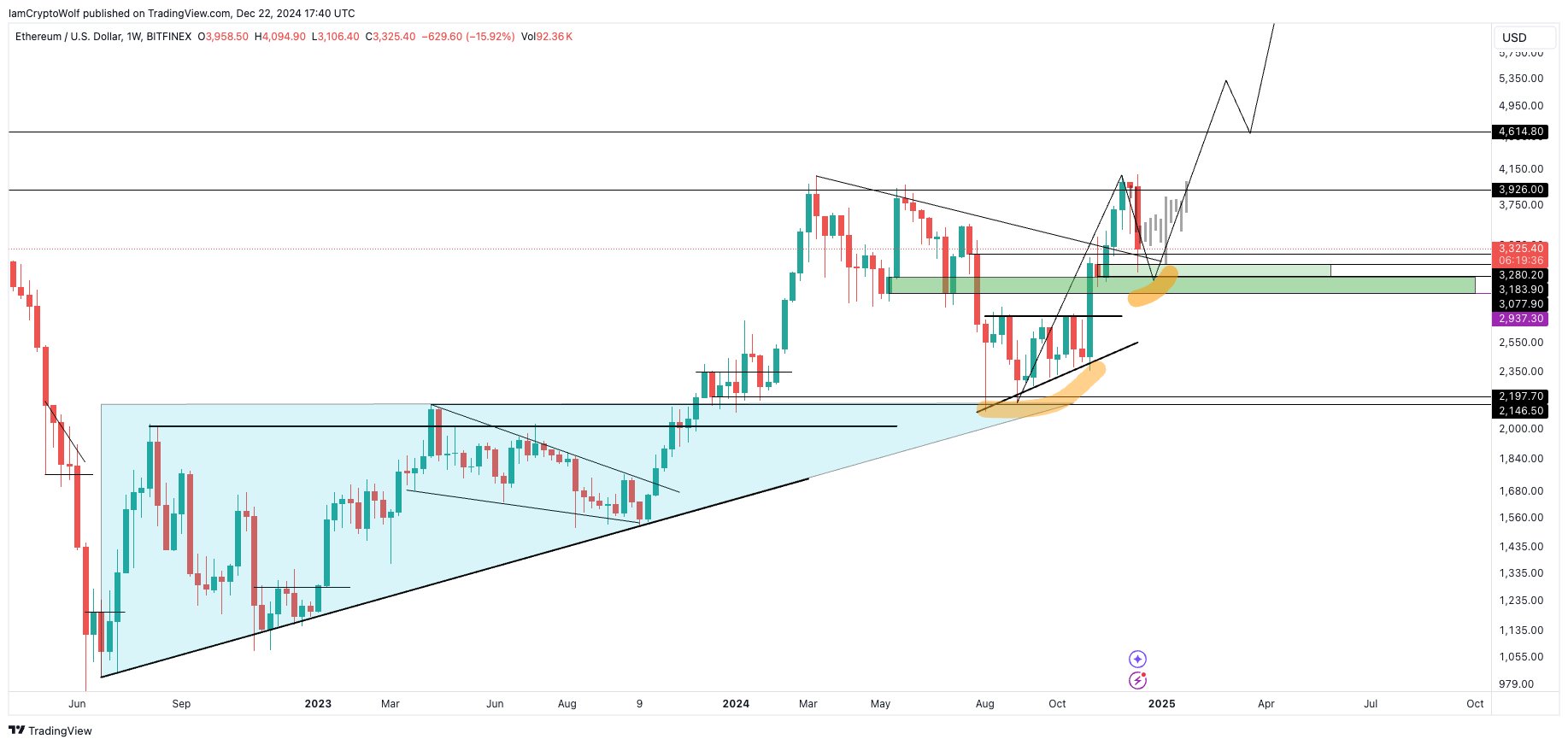 Prominent crypto analyst “I am Crypto Wolf” also highlighted a bullish outlook with a potential inverse head-and-shoulders (iHS) pattern. According to the analyst, Ethereum price chart is currently forming the “right shoulder” of the iHS continuation pattern.