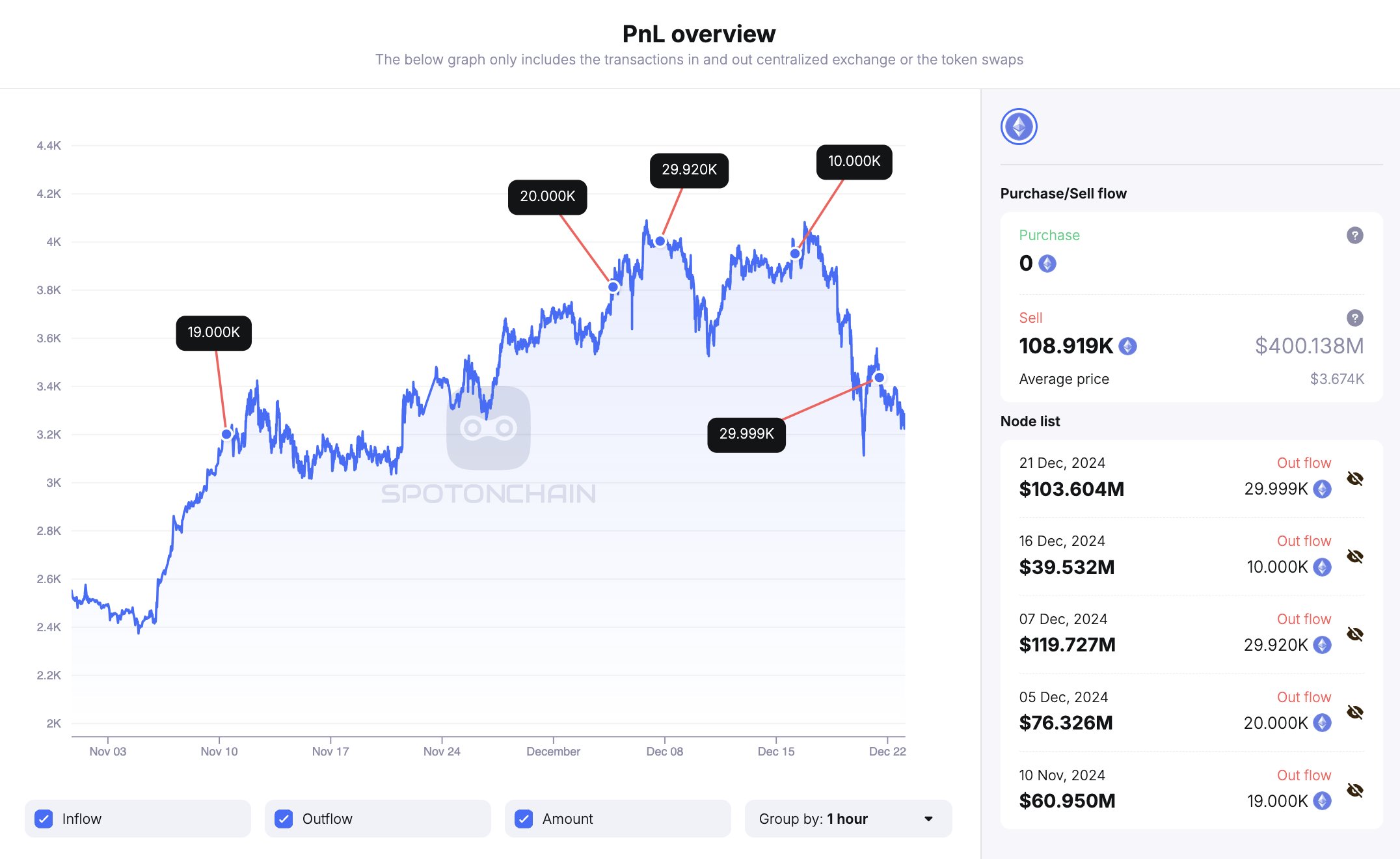 Since November 10, as Ethereum price has trended upward, Sun has deposited a total of 108,919 ETH (worth $400 million) to HTX at an average price of $3,674. Notably, many of these deposits occurred near local price peaks.
